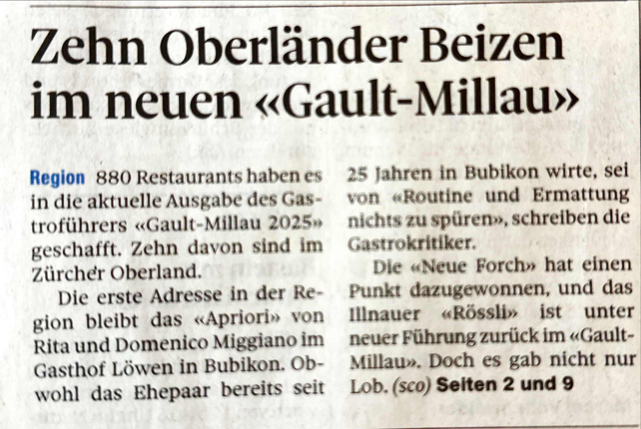 „Gault Millau lässt Rössli Illnau aufsteigen“